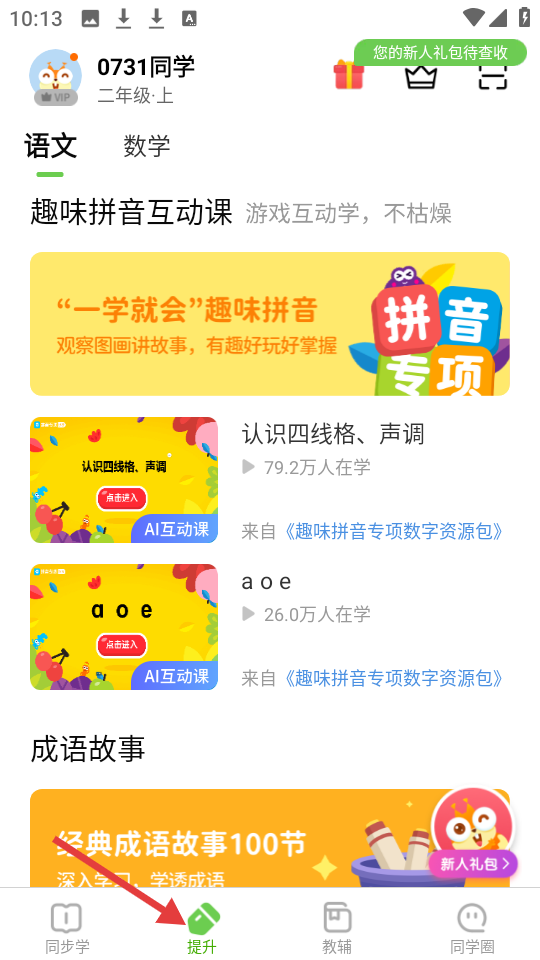 2、提升頁面主打趣味拼音互動課與成語故事等內容,以游戲互動方式激發學習興趣提升知識儲備。