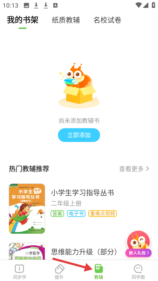 3、教輔界面呈現我的書架,可添加教輔書,還推薦熱門教輔,提供答案、電子書和重難點視頻等資源。
