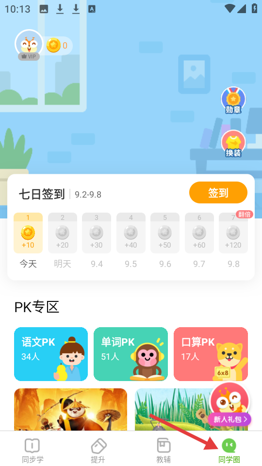 4、同學圈頁面有七日簽到活動,獎勵金幣,設有PK專區,包括語文、單詞、口算PK增添學習的競技性。