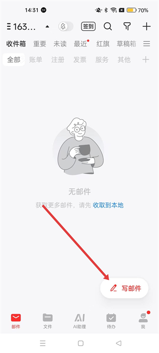 2、進入郵箱界面,可查看收件箱、重要郵件等分類,若無郵件可收取到本地獲取更多郵件,點擊寫郵件可開始撰寫新郵件。