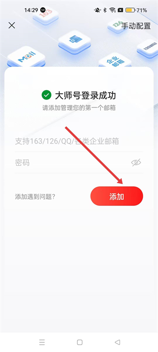 1、大師號登錄成功后,可添加第一個郵箱,支持163、126、QQ等各類企業郵箱,輸入郵箱密碼后點擊添加,即可開始管理郵箱。