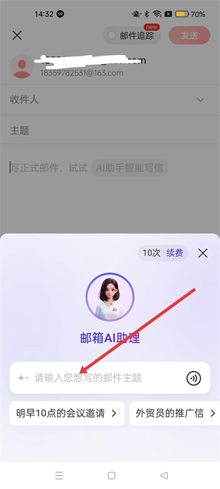 3、寫郵件時,可使用郵箱AI助理,輸入郵件主題,AI助理會提供如會議邀請、推廣信等模板,助力快速撰寫正式郵件。