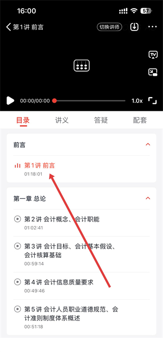 3、課程播放界面可查看目錄講義等板塊,選擇對應課時開始學習,借助課程內容系統掌握會計知識,提升備考效率。