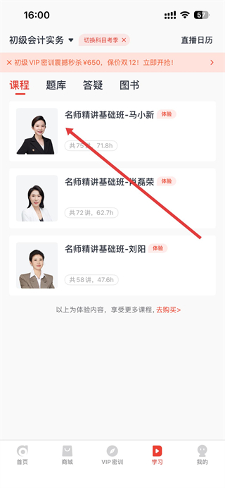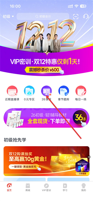 1、初級考種首頁可參與雙12特惠活動,使用章節題庫等學習功能,也能購買輔導教材,借助各類資源推進初級會計備考。