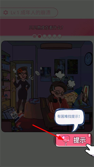 3、遇到困難時點擊提示按鈕,獲取關于貝貝熬夜在看什么的線索提示,助力解謎。