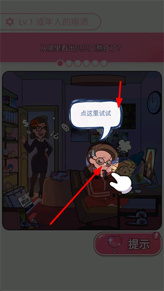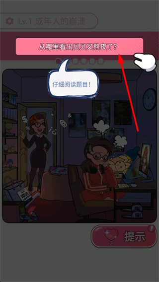 1、進入Lv1成年人的崩潰關卡,仔細閱讀題目從哪里看出貝貝又熬夜了,開始觀察場景尋找線索。