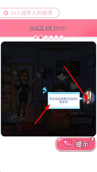 4、根據提示和觀察,確定貝貝熬夜在追娛樂圈內容,完成關卡解謎,推進游戲進程。