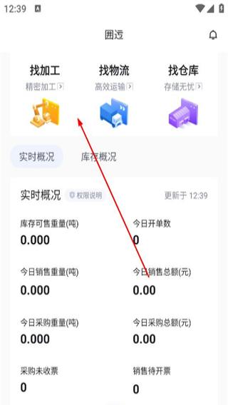3、進入首頁查看找加工找物流等功能入口,瀏覽實時概況里的庫存銷售采購等數據,了解鋼貿生意的運營情況。
