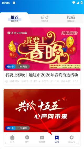 4、點擊底部活動按鈕,進入活動頁面,可看到推薦、活動、投稿等標簽,能參與如我要上春晚等各類活動,了解活動時間、人數等信息。