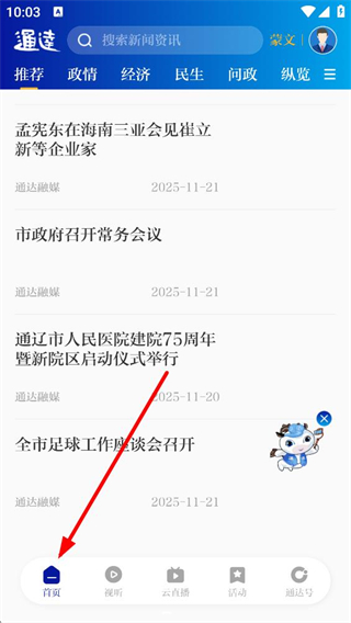 1、進入通達新聞應用后,首頁可瀏覽推薦、政情、經濟等各類資訊,還能使用視聽、云直播等功能入口,獲取本地新聞和多樣服務信息。