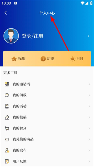2、點擊個人中心入口,進入個人中心界面,可看到收藏、歷史等功能,以及我的邀請碼、我的問政等更多工具選項,點擊登錄、注冊可進入登錄界面。