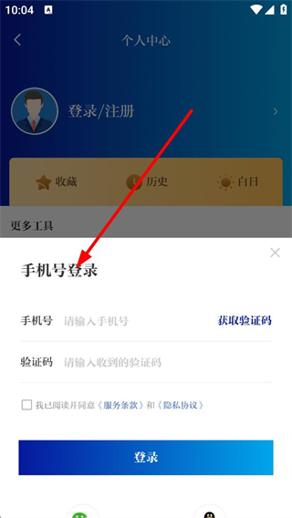 3、登錄界面選擇手機號登錄,輸入手機號、獲取并輸入驗證碼,勾選服務條款和隱私協議后點擊登錄,即可進入應用使用更多功能。