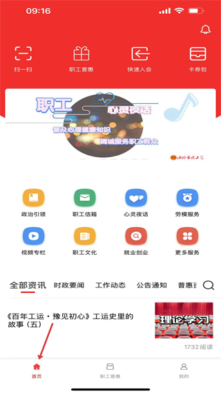 2、首頁,設有掃一掃等功能入口,涵蓋政治引領等服務模塊,同步展示工會相關資訊,為職工提供多元服務入口。