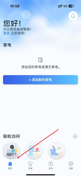 1、進入晶御智能app首頁可查看添加家電功能和輕松訪問的菜譜、支持等入口,點擊菜譜可進入菜譜頁面。