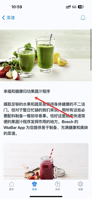 3、在菜譜詳情頁可查看幸福和健康歸功果蔬汁程序的做法,了解果蔬汁的制作原料和步驟,獲取健康美味的菜譜。