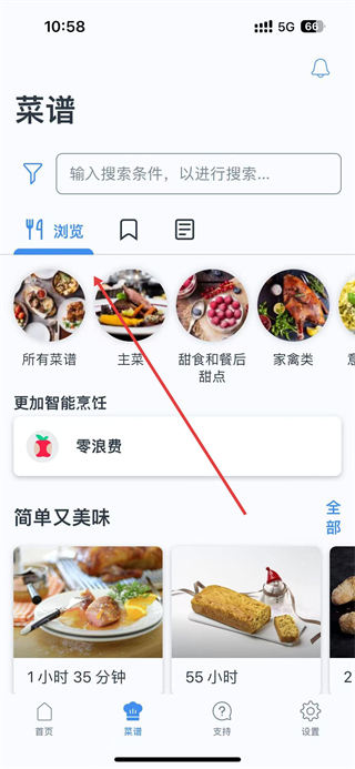 2、點菜譜頁,可搜索菜譜,瀏覽欄展示多樣類別,如主菜、甜點,助力美味烹飪。