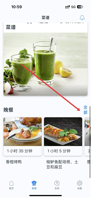 4、菜譜頁面可查看晚餐分類的香橙烤鴨、梭鱸魚配培根等菜譜,點擊全部可查看更多晚餐菜譜,選擇菜譜進行烹飪。