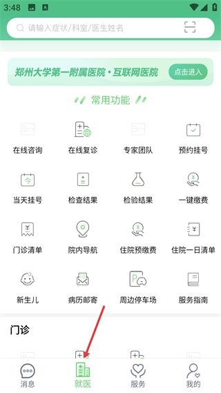 2、進入就醫,展示在線咨詢、預約掛號等功能,關聯鄭大一附院互聯網醫院,是核心醫療服務操作界面。