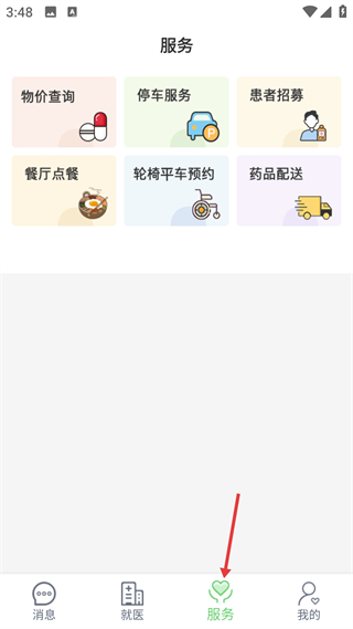 3、服務頁面,涵蓋物價查詢等配套功能,提供餐廳點餐等便民服務,拓展就醫配套體驗。