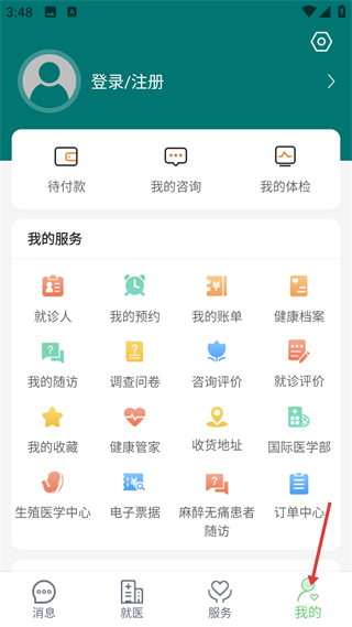 4、我的頁面,含待付款等功能,展示就診人、健康檔案等選項,是個人醫療服務管理界面。