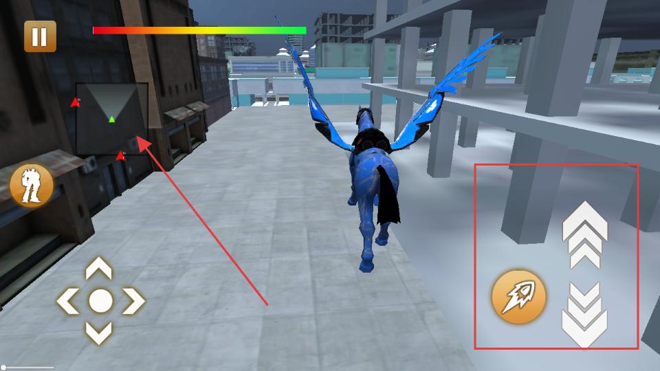 4、切換為飛馬形態后根據左側小地圖的提示,前往目標地點,同時可利用右側的火箭等道具按鈕,對遇到的敵人或障礙進行攻擊,推進游戲進程,爭取順利通關。
