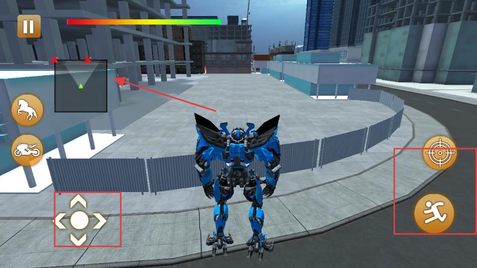 3、機器人形態下用左下角方向鍵移動,右上角瞄準和攻擊按鈕可鎖定攻擊目標,留意左上角小地圖了解目標位置。