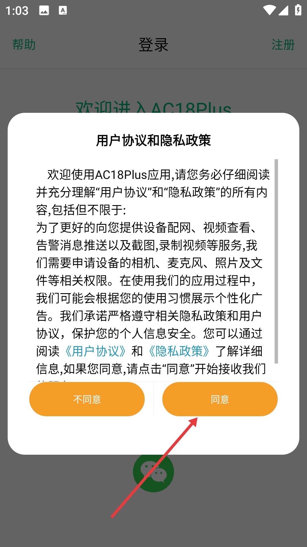 1、使用AC18Plus前,需閱讀用戶協議和隱私政策,同意后可進入登錄頁面,使用應用功能。