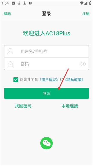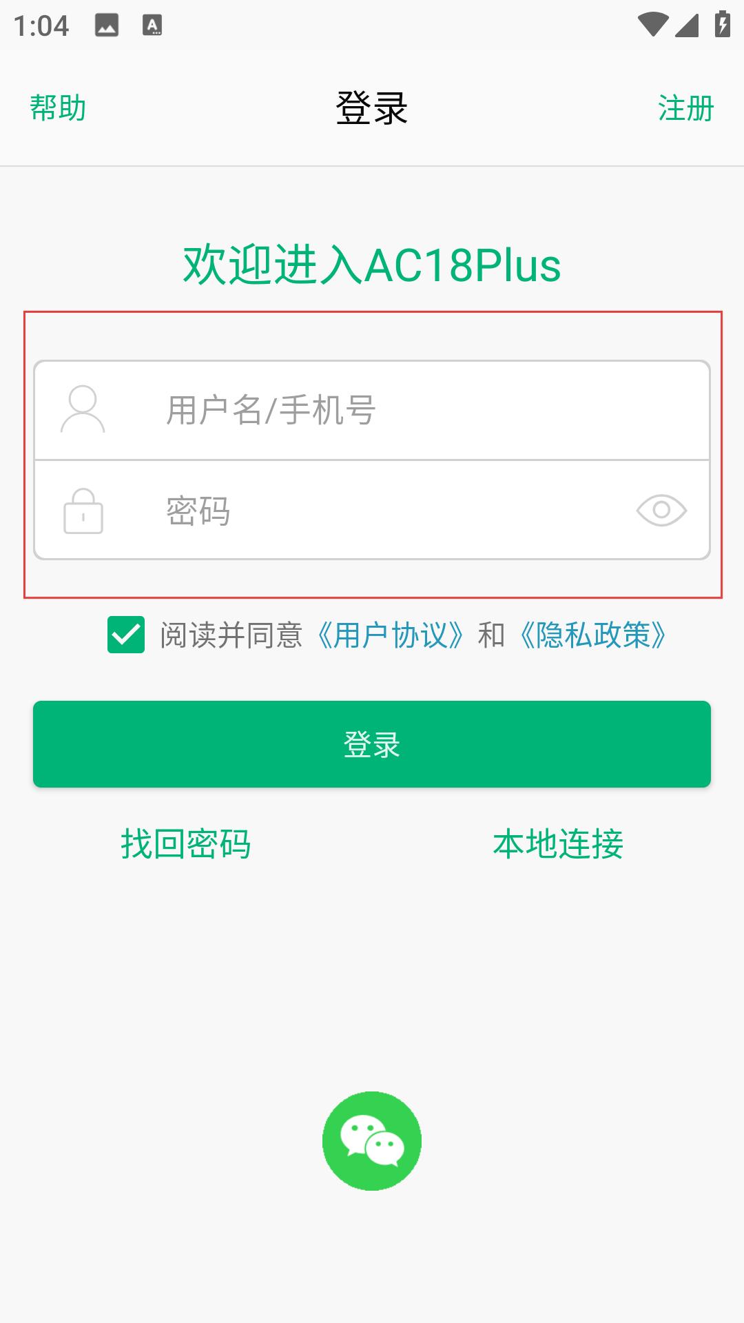1、登錄頁可輸入用戶名手機號和密碼登錄,也可微信登錄,有找回密碼和本地連接功能,需同意用戶協議和隱私政策。
