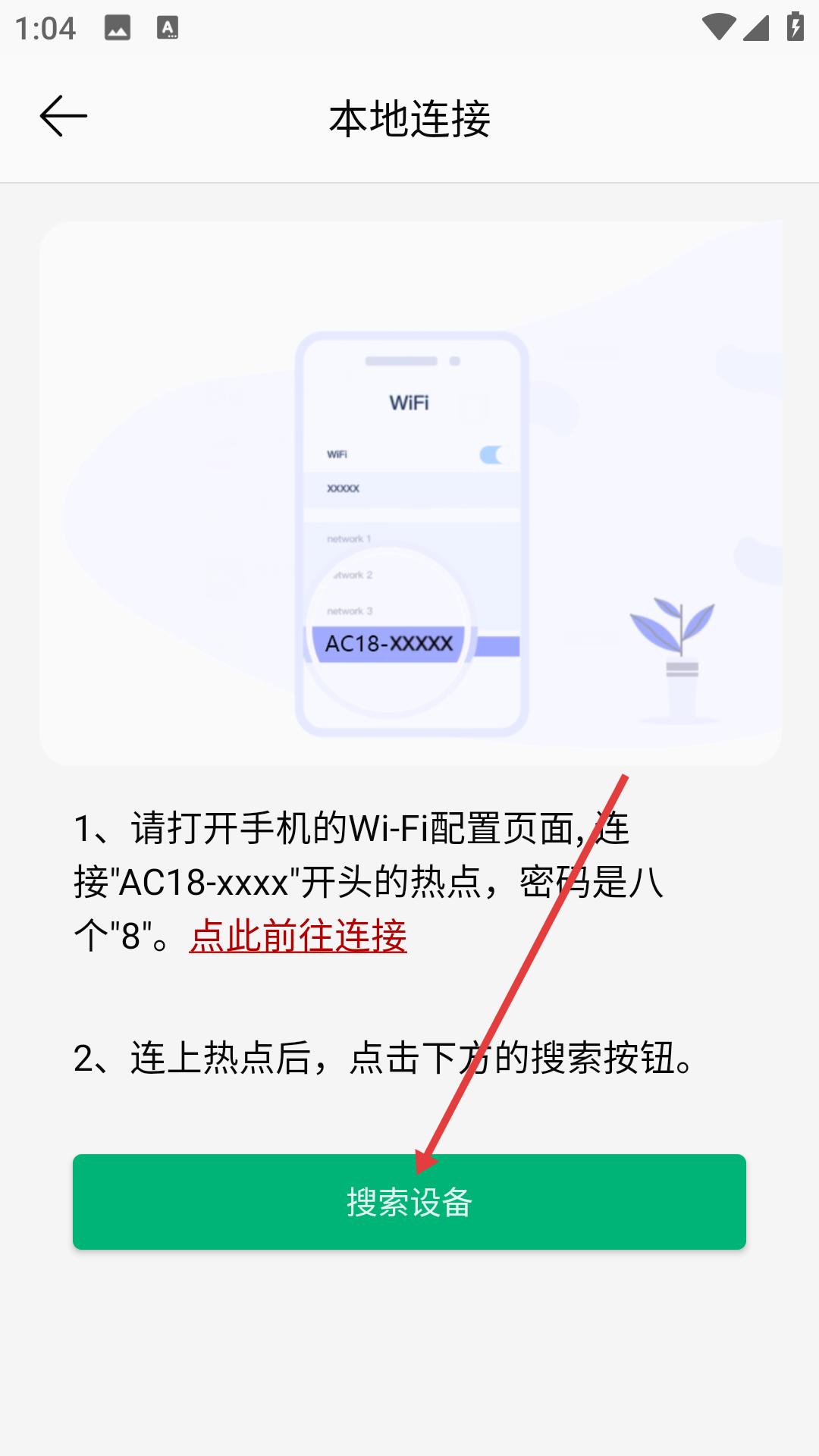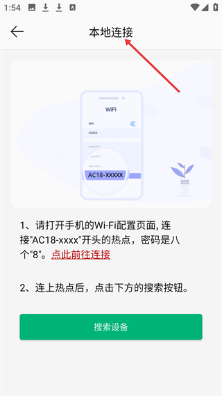 3、本地連接頁面按指引連熱點,點擊搜索設備,可完成設備連接,實現應用本地功能。