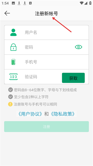 2、注冊頁需填用戶名、密碼、手機號并獲取驗證碼,密碼有格式要求,注冊賬號與手機號可相同,完成后創建新賬號。