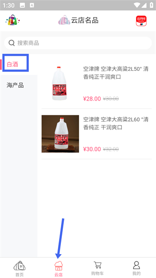 3、云店頁面支持商品搜索與分類篩選,展示對應品類商品的價格信息,是商品精準查找的核心功能區域。