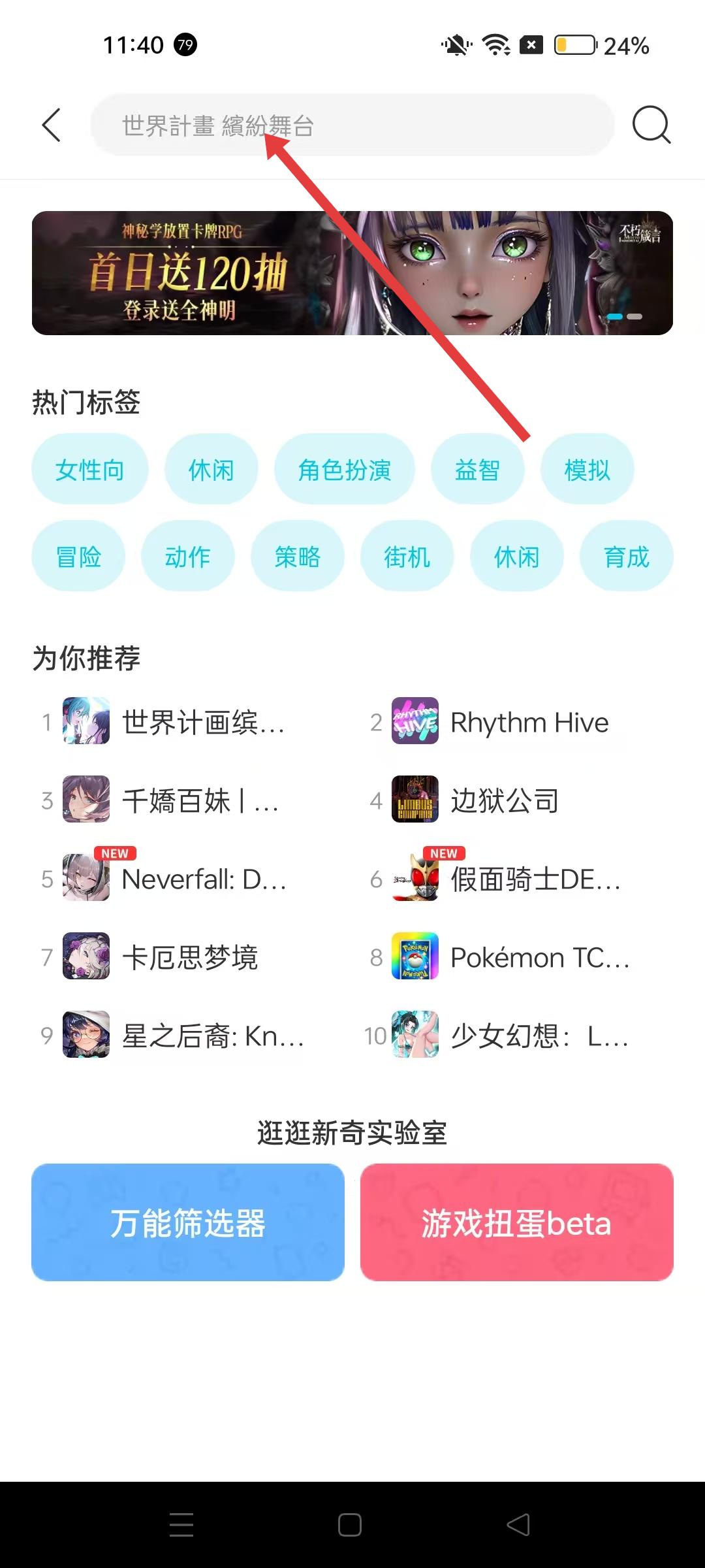 2、進入游戲板塊,頂部有搜索欄,可輸入游戲名稱搜索,同時還有熱門標簽和為你推薦的游戲列表,方便查找感興趣的游戲。