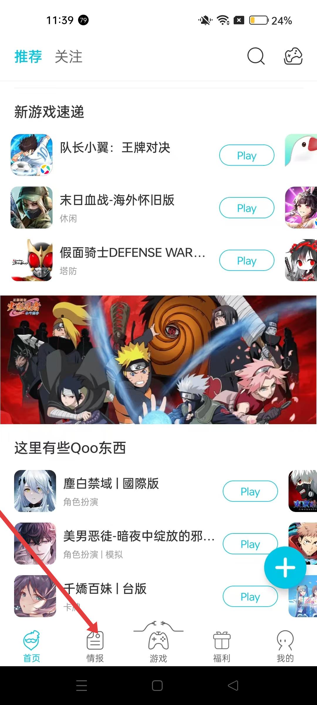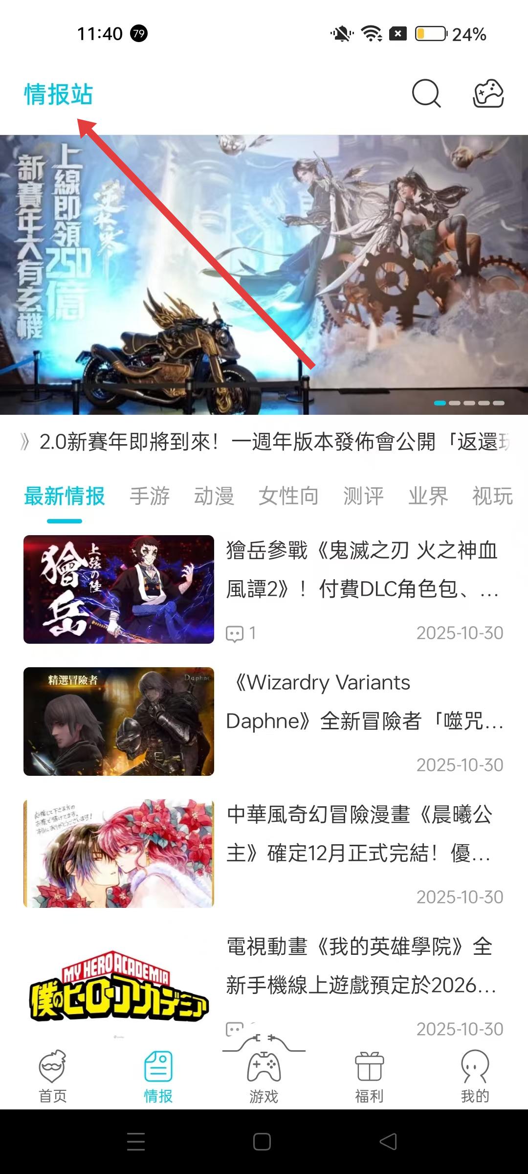 1、QooApp首頁,可點擊情報板塊,進入情報站查看游戲、動漫等最新情報,了解各類游戲動態和行業資訊。