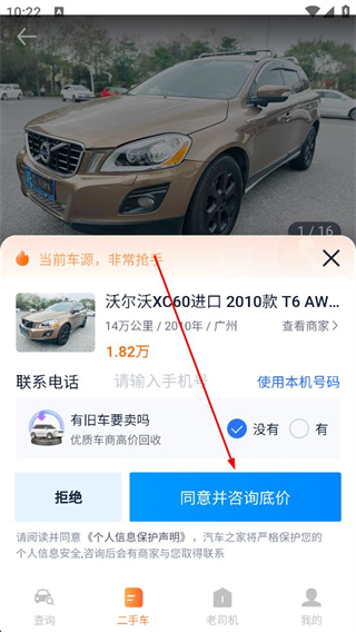 4、在詢價頁面輸入手機號碼,選擇是否有舊車要賣,點擊同意并咨詢底價可獲取車輛底價信息。