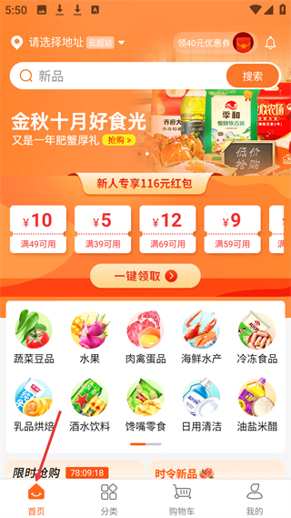 2、首頁設搜索欄,有金秋好食光活動、新人專享紅包,分類涵蓋蔬菜、水果等生活品類,展示限時搶購板塊。