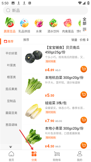 3、分類頁可按蔬菜、水果等品類篩選,展示貝貝南瓜、本地白菜等商品,標注價格及優惠,方便選購生鮮食品。