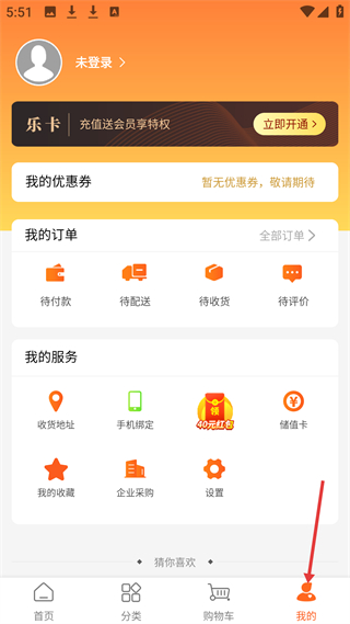 4、我的頁有樂卡會員入口,可管理訂單待付款、待配送等、優惠券,還有收貨地址、手機綁定等服務入口。