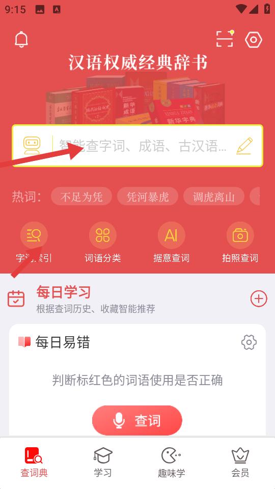 4、主界面搜索欄可查字詞、成語、古漢語,下方有字詞典、詞語分類等功能,還有每日學習模塊,輔助漢語學習。