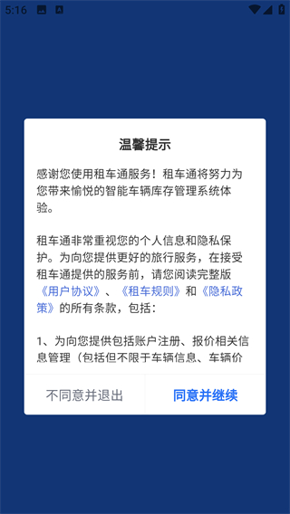 1、進入軟件后會出現溫馨提示,閱讀用戶協議,租車規則和隱私政策后點擊同意并繼續,方可使用租車通服務,開啟租車流程。