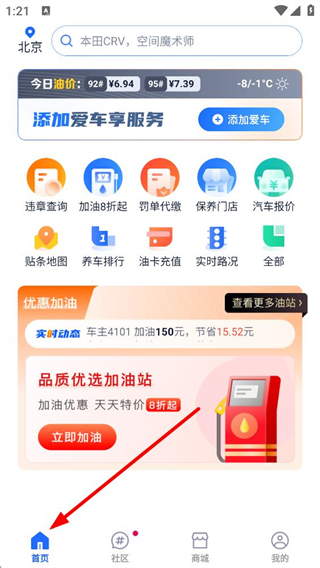 1、進入首頁,可查看今日油價,使用違章查詢、加油8折起等服務入口,還可參與優惠加油活動,方便車主獲取汽車服務和優惠信息。