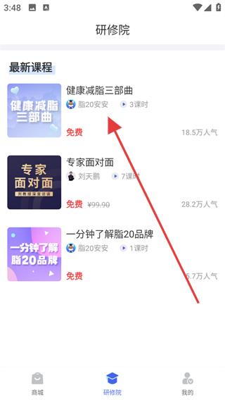 2、登錄后進入研修院頁面,瀏覽健康減脂三部曲、專家面對面等課程,選擇健康減脂三部曲課程進入學習。