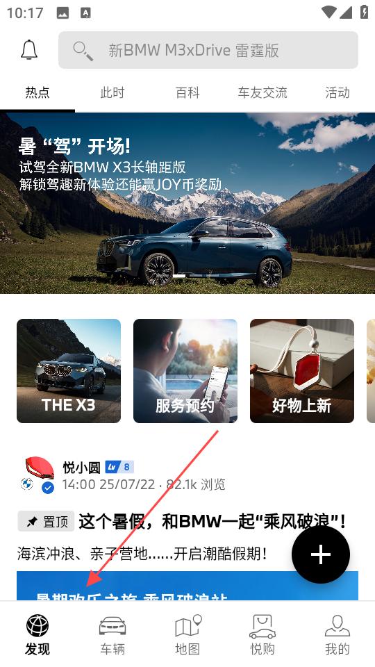 3、發現界面,有熱點、此時等多個功能分類,還有新BMWM3xDrive雷霆版等車輛信息和服務預約等功能入口。