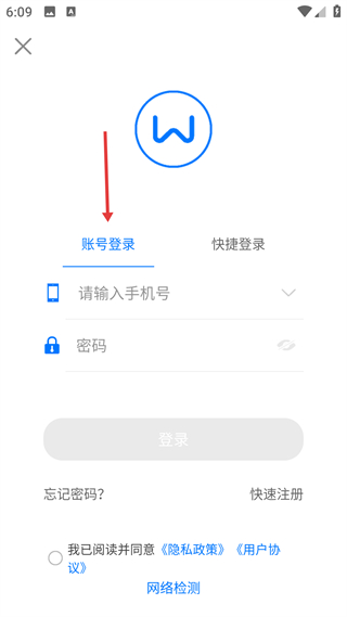 1、賬號登錄頁,有賬號和快捷登錄方式,需填手機號密碼,勾選協議可登錄,支持忘密碼和快速注冊。