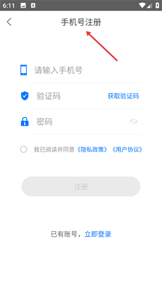 2、手機號注冊頁,需填手機號收驗證碼,設密碼并勾選協議完成注冊,已有賬號可跳轉登錄。