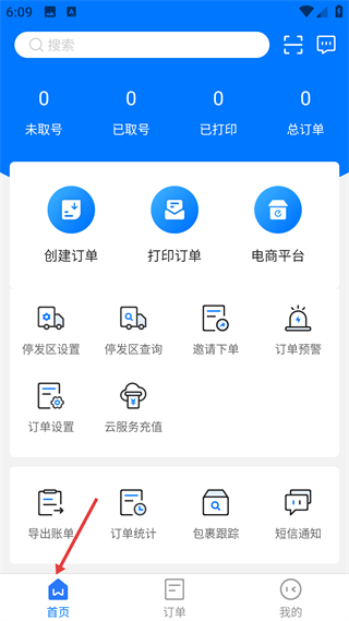 3、首頁功能頁,展示訂單狀態統計,含創建訂單等入口,覆蓋訂單管理、電商對接等操作需求。
