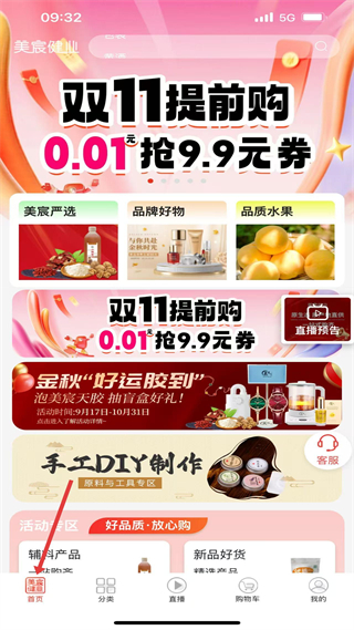 1、首頁推雙11提前購,0.01元搶9.9元券,設美宸嚴選、品牌好物等板塊,還有泡膠抽盲盒、手工DIY原料工具專區。