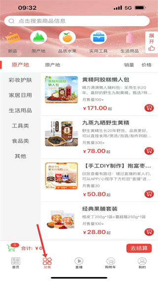 2、分類頁有新品、原產地等分類,原產地板塊售黃精阿膠糕、野生黃精等,分類清晰便于用戶查找心儀商品。