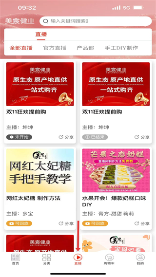 4、直播頁有全部直播等分類,含雙11提前購、網紅太妃糖教學等直播,部分可回放,方便用戶觀看購物直播。