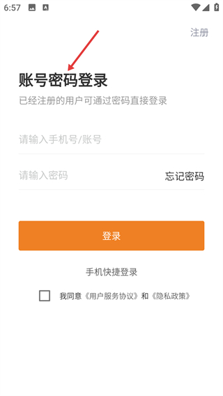 1、進入賬號密碼登錄界面,已注冊用戶可輸入手機號或賬號及密碼,勾選用戶服務協議和隱私政策后點擊登錄,也可選擇手機快捷登錄或找回密碼。