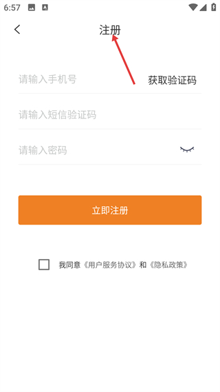 2、進入注冊界面需輸入手機號,點擊獲取驗證碼并填寫短信驗證碼,設置密碼后勾選相關協議,點擊立即注冊按鈕完成賬號的注冊操作。